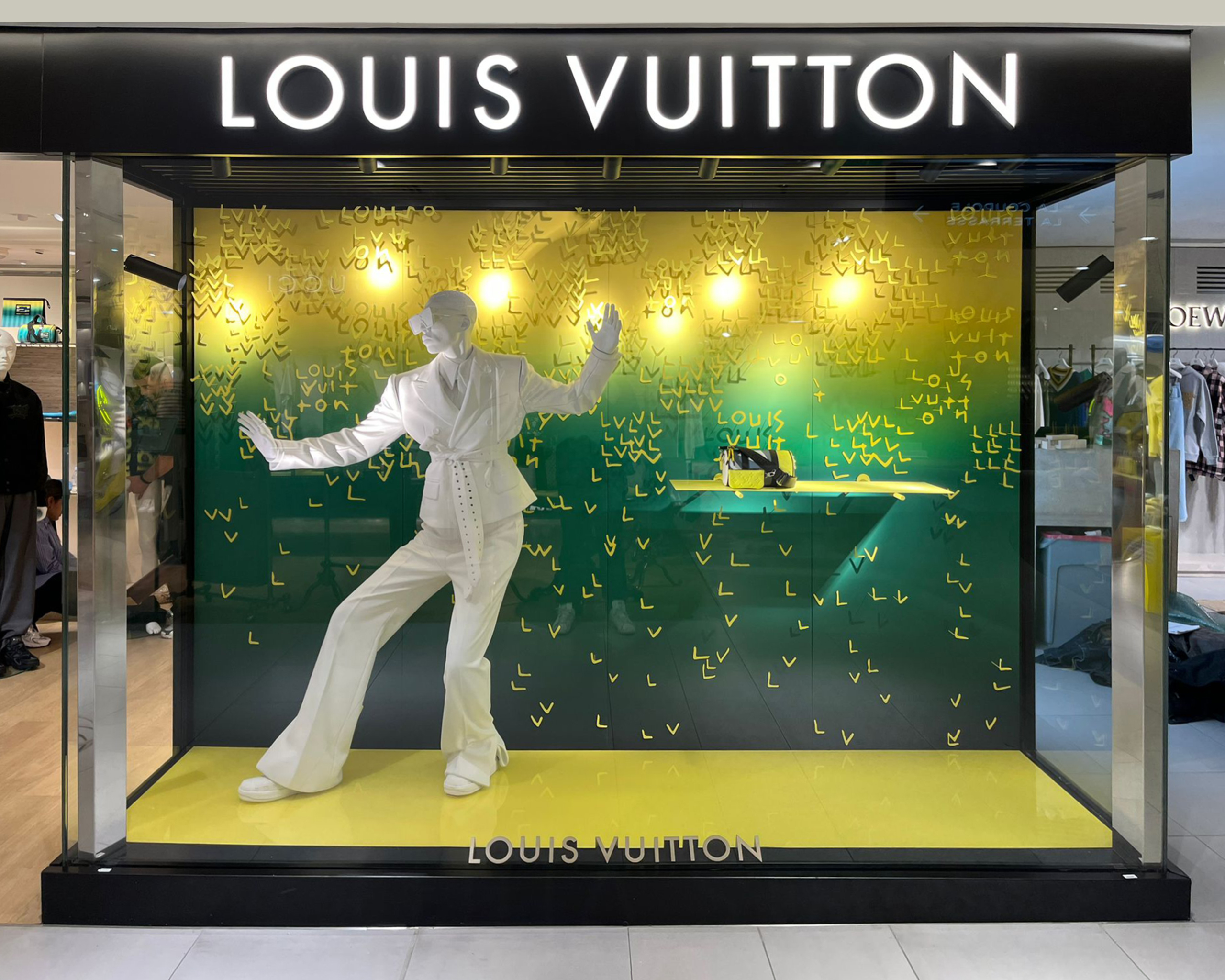 Réalisation de la vitrine et éléments de scénographie pour le pop-in Louis Vuittons aux Galeries Lafayette en mars 2022.